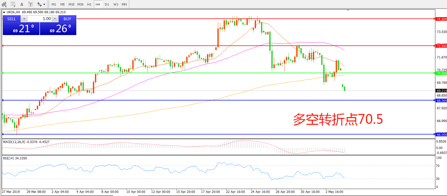 交易策略:在70.50   之下看跌,目标68.50    66.00