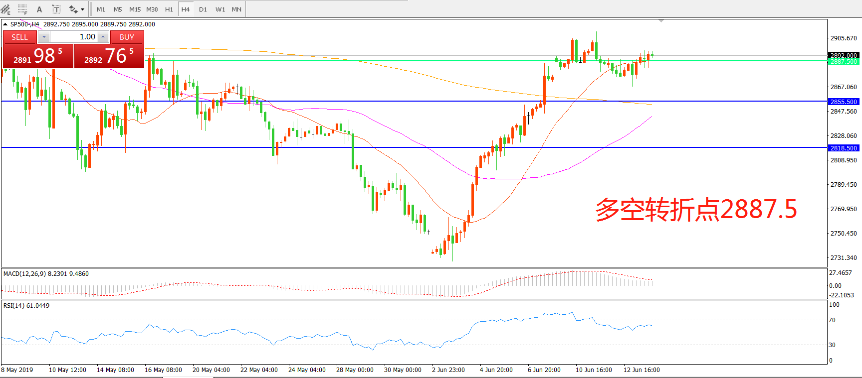 4小时图看,标普高位震荡后暂时企稳,2887.5依然是短期争夺焦点,短期均线走平,MACD红柱减少,RSI指标走平,日内延续高位震荡思路概率较大。