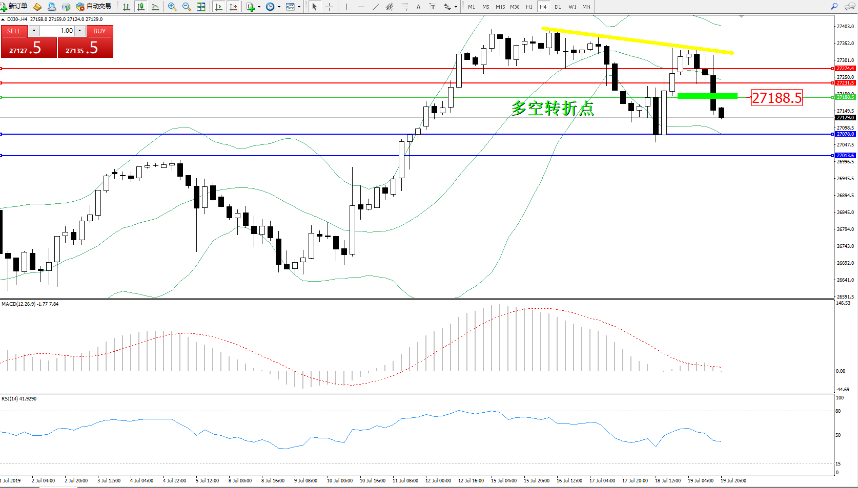 道琼斯指数719日(周五)收盘下跌68.80点,跌幅0.25%,报27154.20点。美国股市上周五延续了当周的跌势,一方面由于波斯湾紧张局势升级,另外投资者猜测美联储将会把降息幅度限制在25个基点。根据美联储官员近期的公开声明及采访来看,美联储因担忧全球经济增长放缓、贸易不确定性上升及通胀回落等问题,准备在即将召开的议息会议上降息25个基点,进一步降息亦成可能。目前综合各官员态度分析,美联储尚未准备采取更为大胆的行动,在7月会议上行降息50个基点的可能性较小。