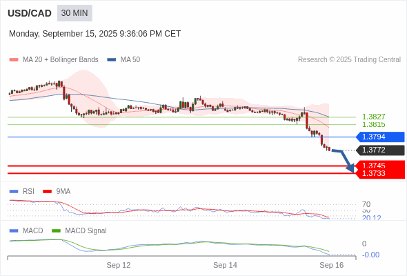 美元/加元 当日内 : RSI是超卖的