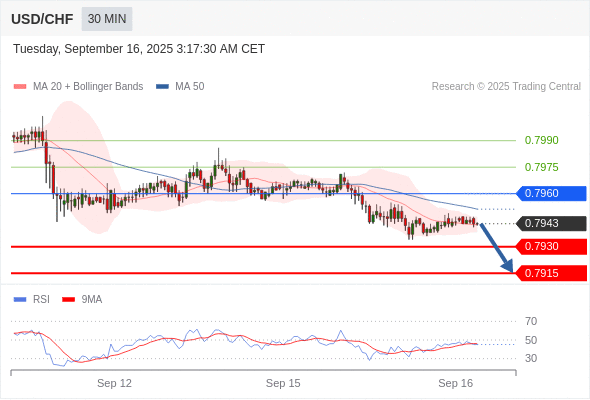 在 0.7960 之下,看跌,目标价位为 0.7930 ,然后为 0.7915 。