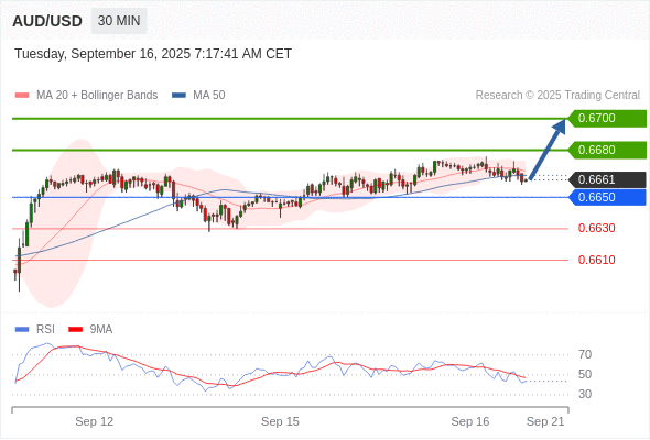 在 0.6650 之上,看涨,目标价位为 0.6680 ,然后为 0.6700 。