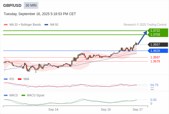 英镑/美元 当日内 : 看涨,当 1.3628 为支撑位。