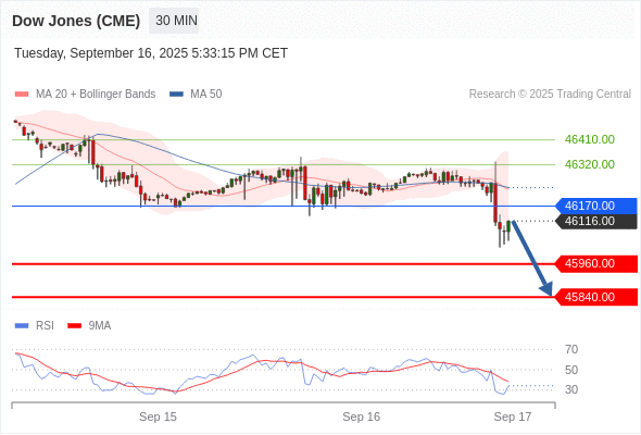 在 46170.00 之下,看跌,目标价位为 45960.00 ,然后为 45840.00 。