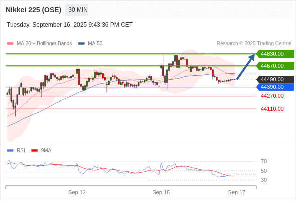 日经225股指期货 (OSE) 当日内: 超短线(当日内)支撑位在44390.00附近。