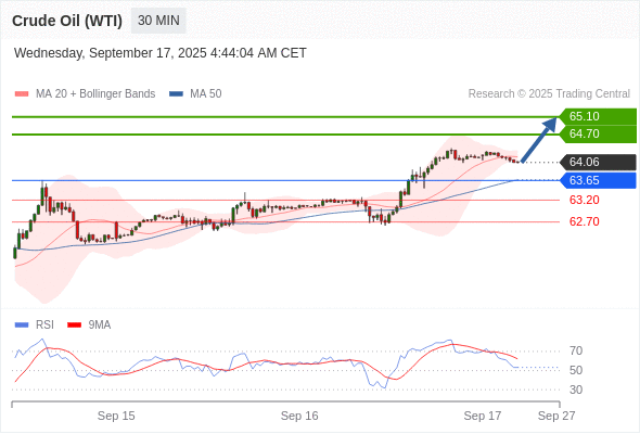 在 63.65 之上,看涨,目标价位为 64.70 ,然后为 65.10 。
