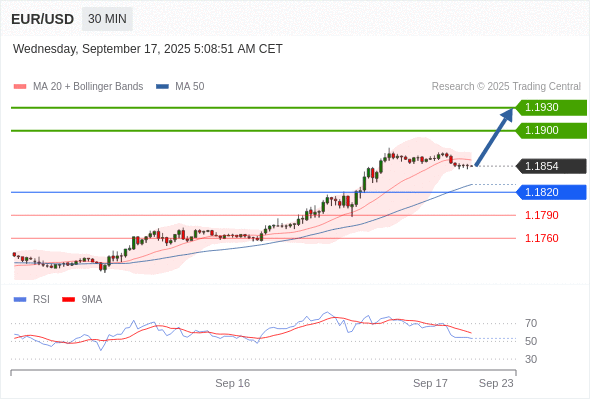 在 1.1820 之上,看涨,目标价位为 1.1900 ,然后为 1.1930 。