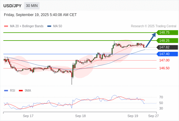 在 147.40 之上,看涨,目标价位为 148.25 ,然后为 148.75 。