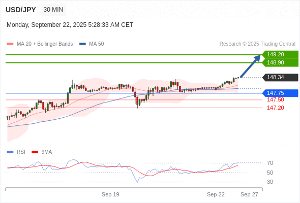 在 147.75 之上,看涨,目标价位为 148.90 ,然后为 149.20 。