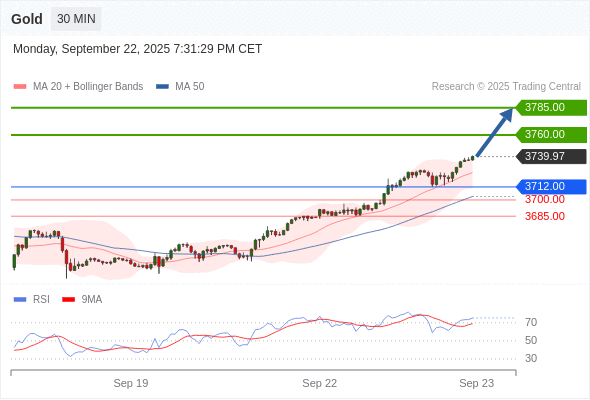 在 3712.00 之上,看涨,目标价位为 3760.00 ,然后为 3785.00 。