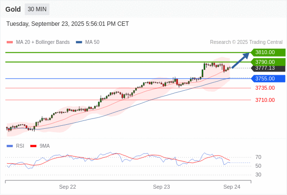 在 3755.00 之上,看涨,目标价位为 3790.00 ,然后为 3810.00 。