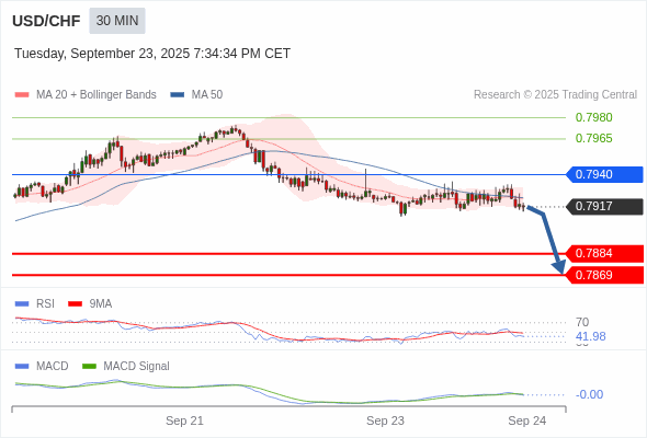 美元/瑞郎 当日内 : 看跌,在 0.7940 之下。
