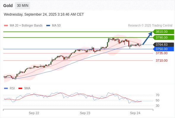 在 3750.00 之上,看涨,目标价位为 3790.00 ,然后为 3810.00 。
