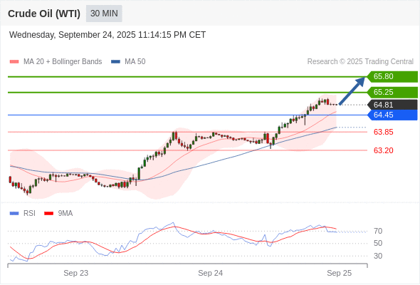 在 64.45 之上,看涨,目标价位为 65.25 ,然后为 65.80 。