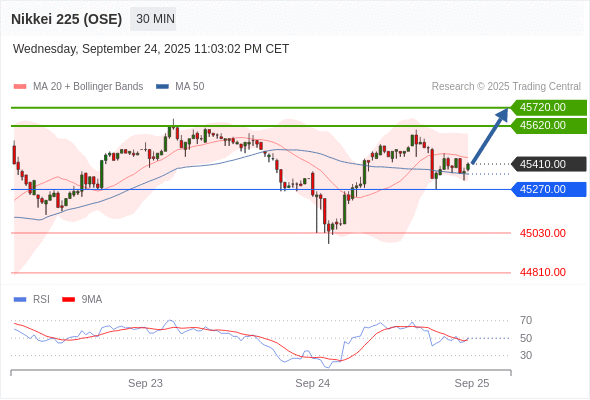 日经225股指期货 (OSE) 当日内: 超短线(当日内)支撑位在45270.00附近。