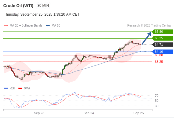 在 64.10 之上,看涨,目标价位为 65.25 ,然后为 65.80 。