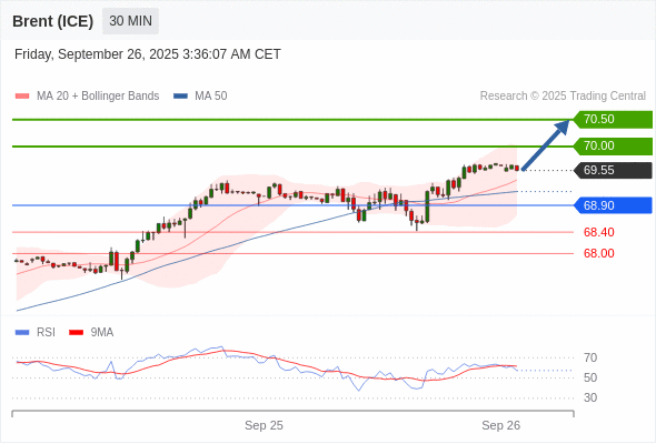 在 68.90 之上,看涨,目标价位为 70.00 ,然后为 70.50 。