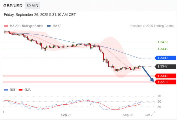 交易策略: 在 1.3390 之下,看跌,目标价位为 1.3300 ,然后为 1.3270 。
