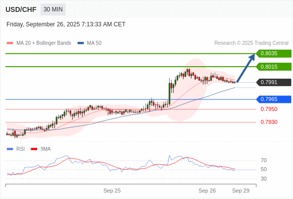 在 0.7965 之上,看涨,目标价位为 0.8015 ,然后为 0.8035 。