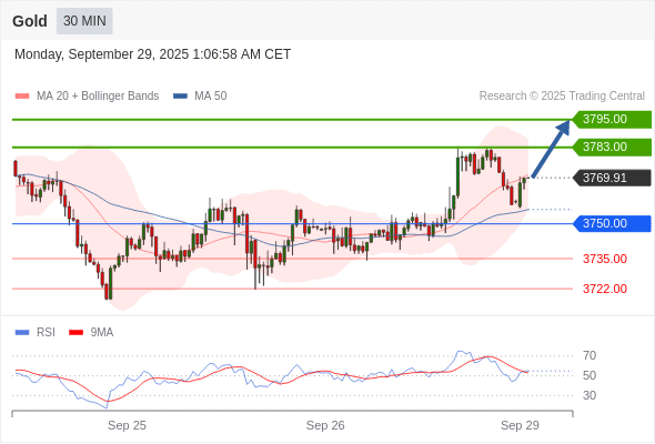 在 3750.00 之上,看涨,目标价位为 3783.00 ,然后为 3795.00 。