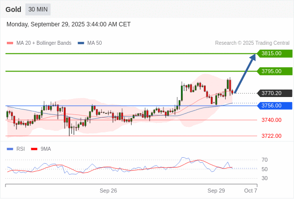 在 3756.00 之上,看涨,目标价位为 3795.00 ,然后为 3815.00 。