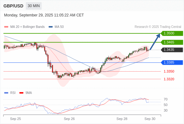 在 1.3385 之上,看涨,目标价位为 1.3465 ,然后为 1.3500 。