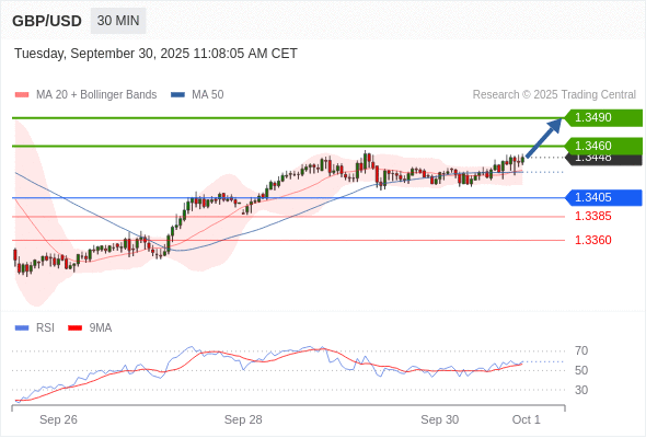 在 1.3405 之上,看涨,目标价位为 1.3460 ,然后为 1.3490 。