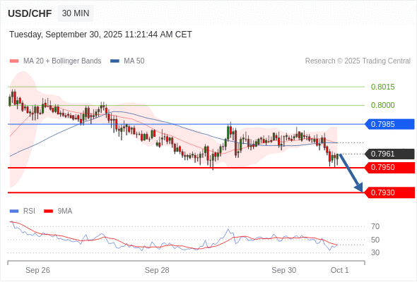 在 0.7985 之下,看跌,目标价位为 0.7950 ,然后为 0.7930 。