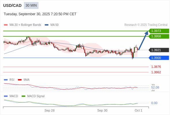 美元/加元 当日内 : 看涨,当 1.3900 为支撑位。