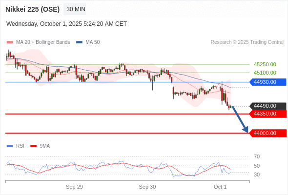 在 44930.00 之下,看跌,目标价位为 44350.00 ,然后为 44000.00 。