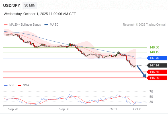 在 147.70 之下,看跌,目标价位为 146.65 ,然后为 146.20 。