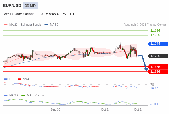 欧元/美元 当日内 : 看跌,在 1.1774 之下。