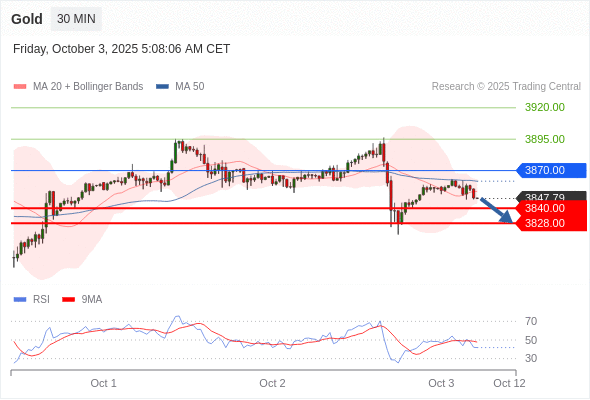 交易策略: 在 3870.00 之下,看跌,目标价位为 3840.00 ,然后为 3828.00 。
