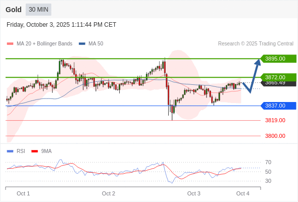在 3837.00 之上,看涨,目标价位为 3872.00 ,然后为 3895.00 。