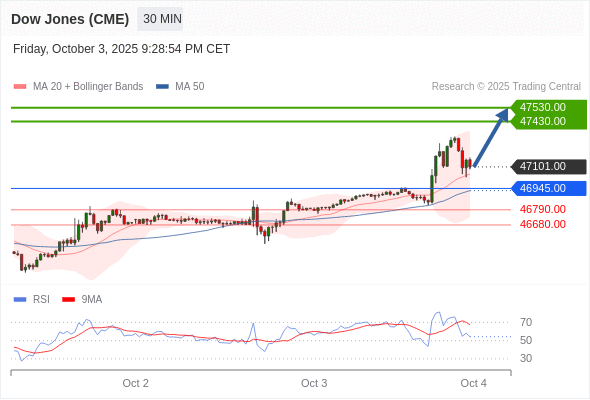 在 46945.00 之上,看涨,目标价位为 47430.00 ,然后为 47530.00 。