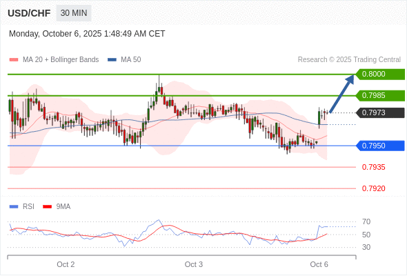 在 0.7950 之上,看涨,目标价位为 0.7985 ,然后为 0.8000 。