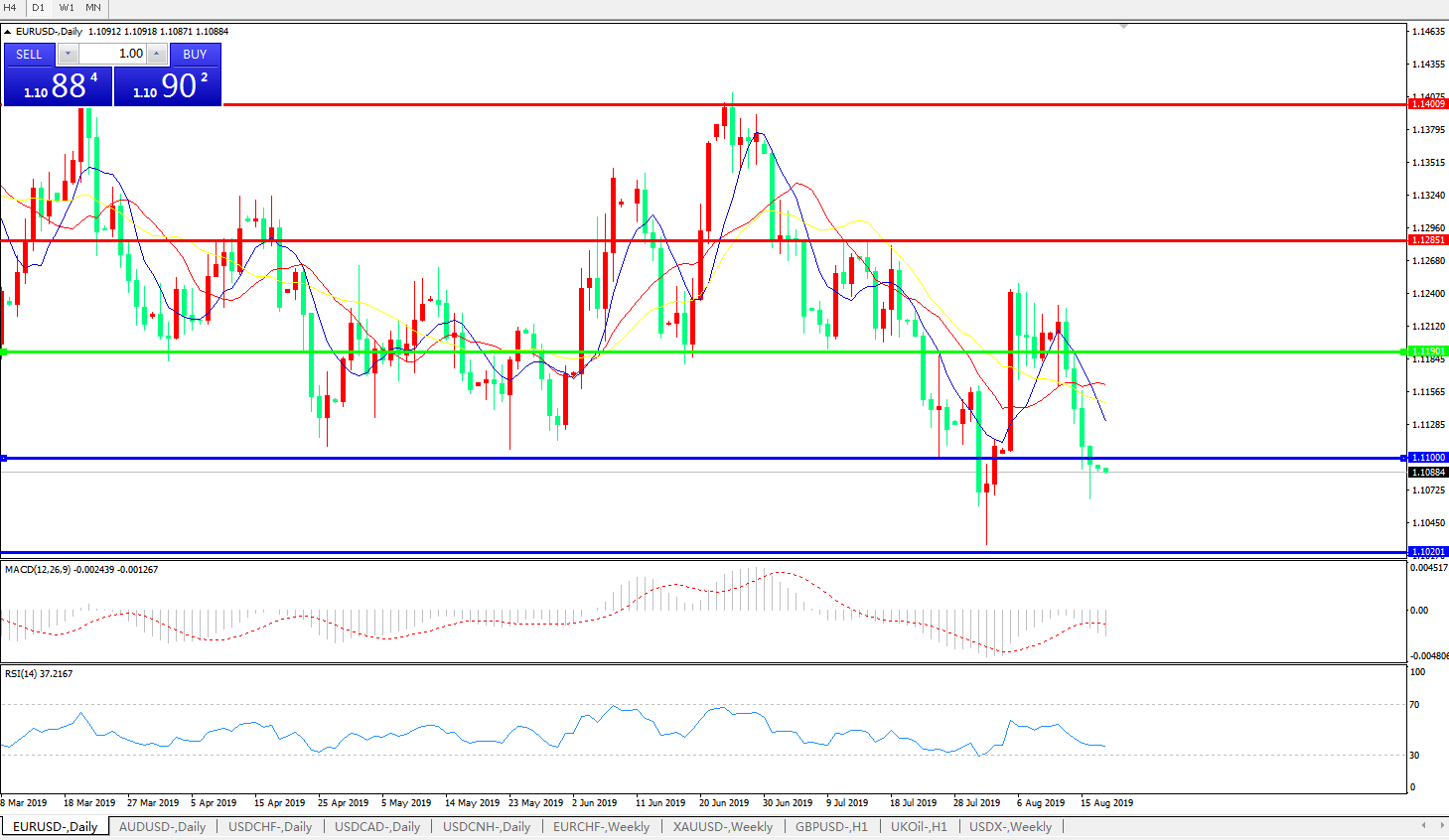 技术面简析:日图均线呈下行态势,汇价开始跌破重要支撑,MACD下行中且动能柱延续放量态势,RSI缓步走低,预计短期汇价存进一步下行需求,中期汇价需关注前低1.10附近支撑是否持续有效。