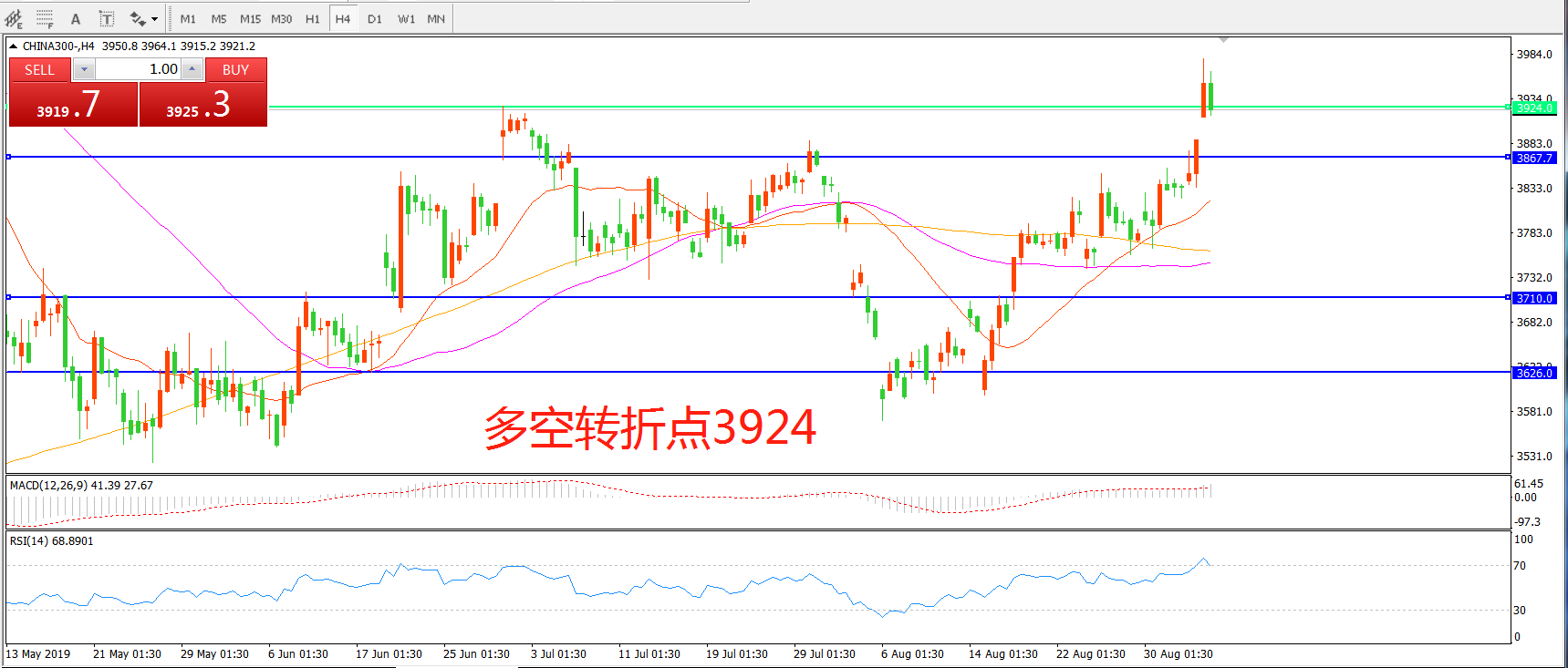 4小时图看,沪深300高开高走,日内虽有冲高回落,但整体走势偏强,均线系统呈多头排列,MACD红柱增加,RSI指标走平,日内延续上行概率较大。