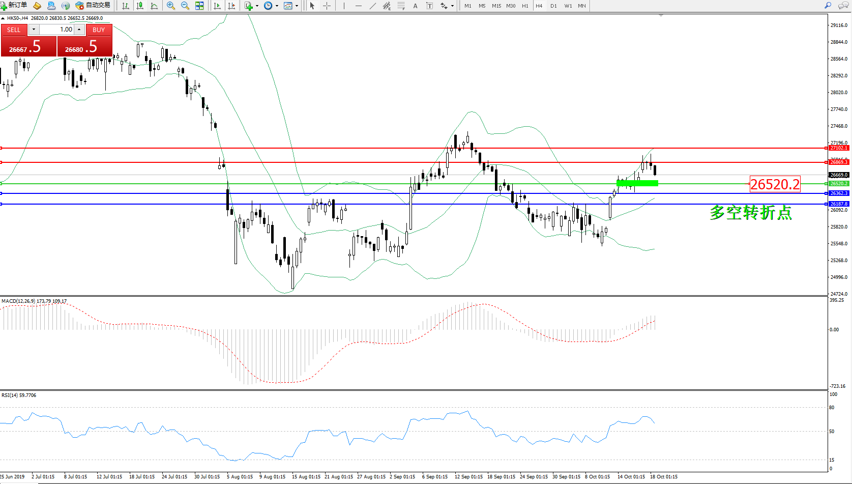 香港恒生指数10月18日(周五)收盘下跌128.91点,跌幅0.48%,报26719.58点;港股早上跟随外围造好而高开,随后再扩大升幅,恒指高见26985,最多升136点。始终未能冲破27000关口。恒指在连升两日后,已见疲态。恒指见沽压后回落倒跌,低见26775。对于港股而言,最近并不是交易清淡,而是可资讨论的话题不多。短期博弈本地票,还是有一定风险,碍于篇幅不方便展开,但股指走势和宏观数据已经明了,多空双方等待的无非就是一个明确的信号。