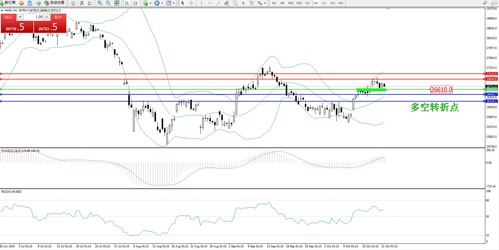 香港恒生指数1021日(周一)收盘上涨6.10点,涨幅0.02%,报26725.68点;股早上小幅低开4点,恒指低见26658。随后有买盘支持而企稳造好,重上升轨,最多升98点,高见26818。英国脱欧再次出现延期,加之欧美贸易紧张情绪重燃,经济前景阴霾未除。美国贸易代表办公室在发出的通知中称,对欧盟商品计划加征的10%25%关税于1018日生效。前景未明之前,恒指今日或仍以震荡走势为主。