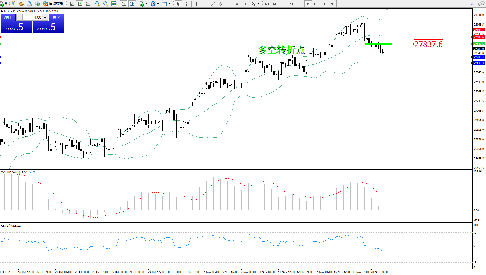 道琼斯指数DJ30—— 4小时K线图显示: