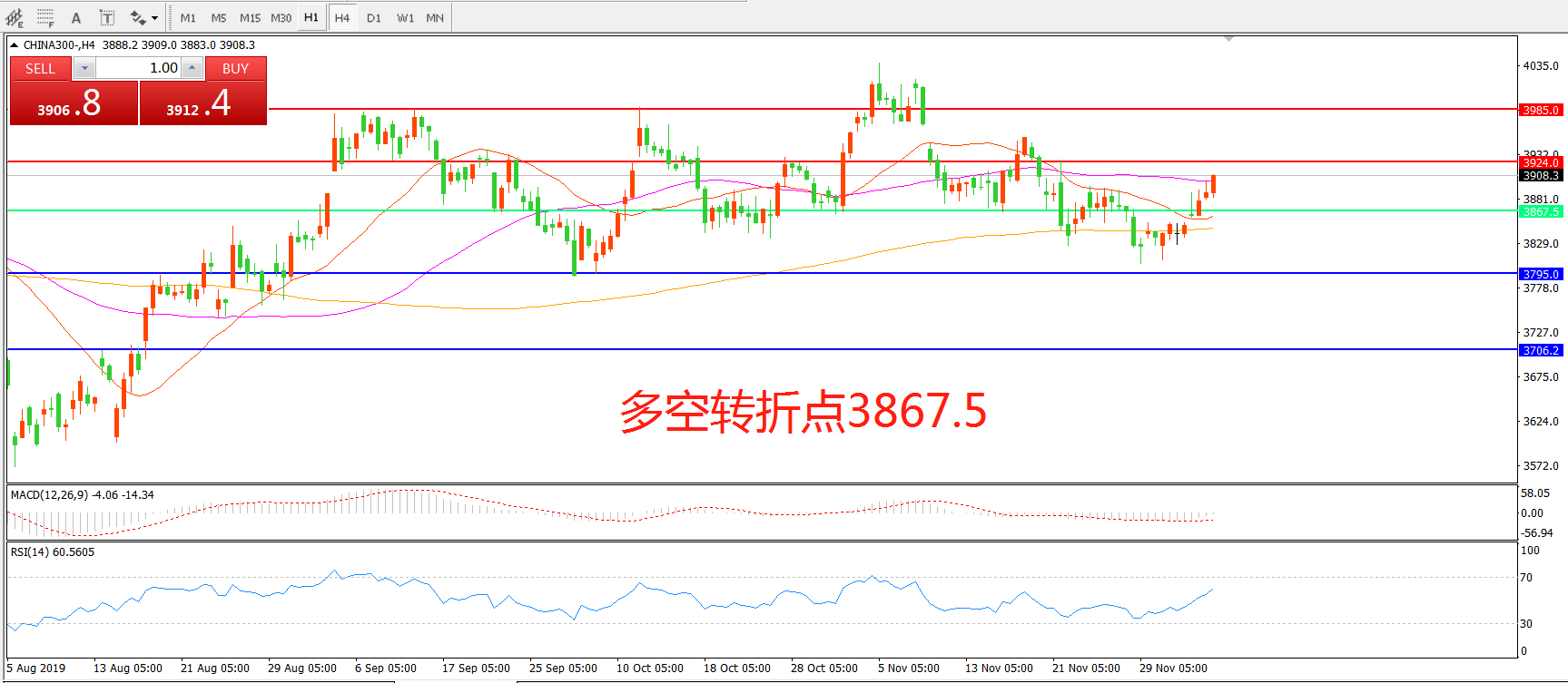 4小时图看,沪深300阳线连续上行,突破前期整理区间,整体走势有所回暖,均线系统走平,MACD绿柱缩短,RSI指标向上,日内震荡上行概率较大。