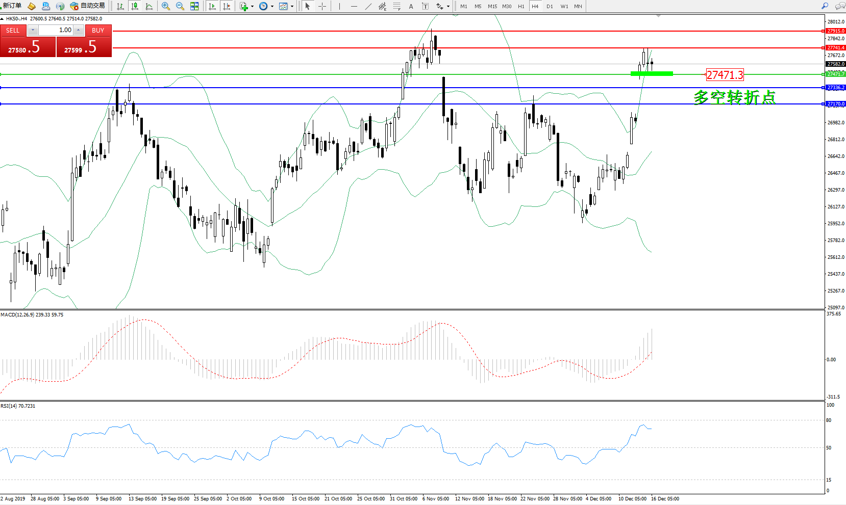 香港恒生指数1216日(周一)收盘下跌179.67点,跌幅0.65%,报27508.09点;外围好消息带动港股上周五急升693点,恒指更以是日高位27687收市。成交金额更超越千亿至1173亿元。月初悲观时曾跌26000,低见25995,但仅7日,巳见急速反弹1692点。市场最关注的两大事件终于有了新的突破:中美第一阶段经贸协议文本达成一致和英国大选保守党获胜。两者均对股市形成利好,提振市场风险投资情绪。