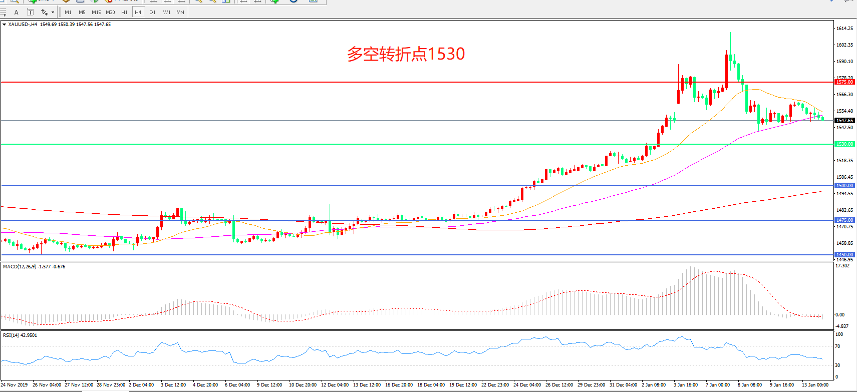 周一(1月13日),中美第一阶段贸易协议即将签署和中东局势缓和的迹象令避险情绪收到打压,现货金价震荡回落,收报1548.03美元/盎司。上周五公布的非农就业报告不佳曾短暂支撑金价,但周一金价收回了大部分涨幅之后陷入了震荡。目前市场焦点集中在两大国的贸易谈判和美伊局势的最新进展。