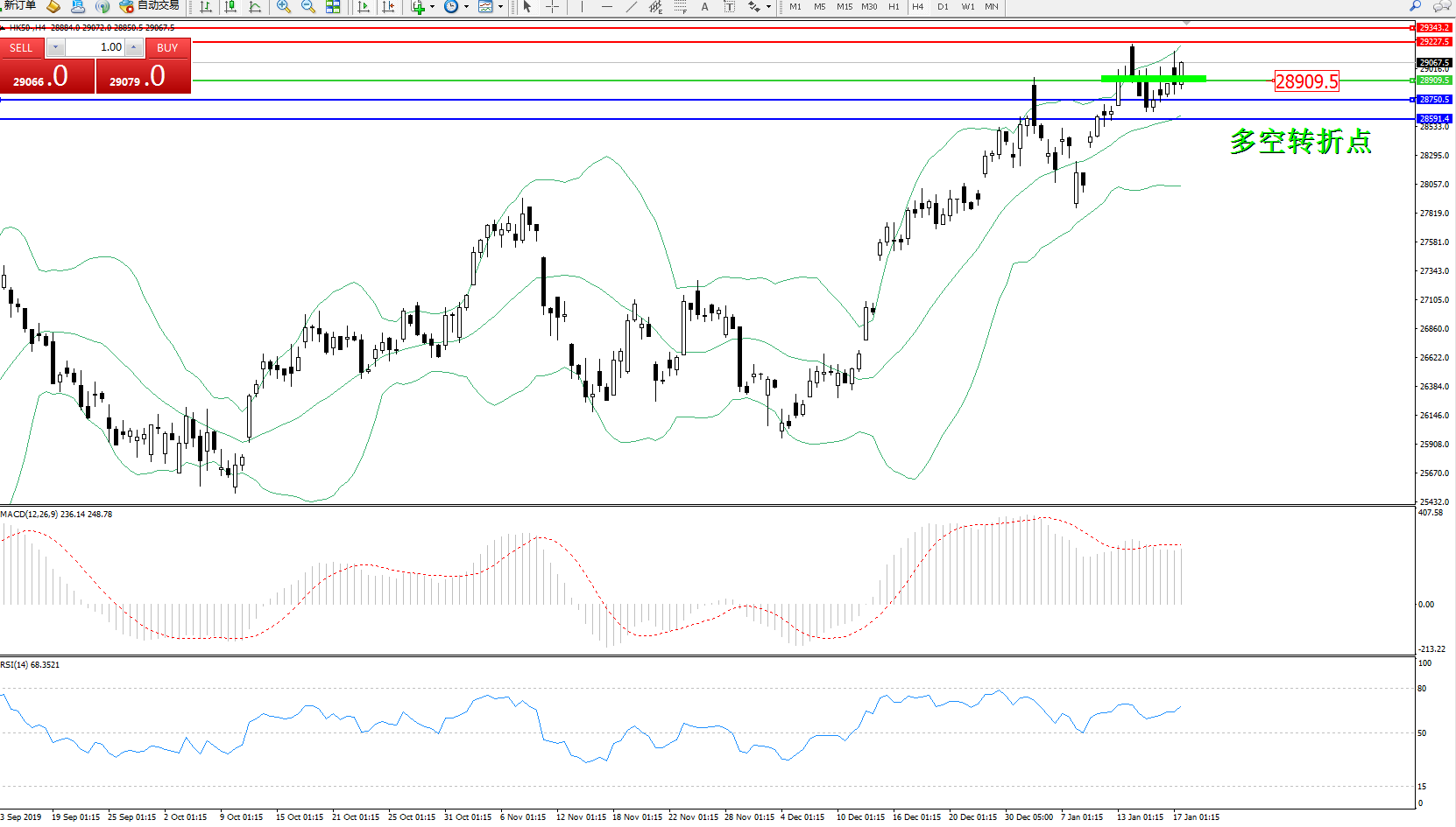 香港恒生指数1月17日(周五)收盘上涨173.38点,涨幅0.60%,报29056.42点;港股早上跟随美股创历史新高收市而高开,但仅升过百点。高位见沽盘即回落倒跌,恒指最低见28813。内地公布数据理想,大市低位企稳后再反弹造好,高见29101,重上29000关口,上周首次申请失业救济人数意外减少,同时2019年12月零售销售月率为0.3%,符合市场预期。港股目前处于相对高位,在无利好消息的继续刺激下,预计恒指走势依然会偏向稳健。注意到恒指尾盘有小幅拉升的动作,可以说目前市场投资氛围依然积极活跃,长期来看,港股还具备良好的上升势头。
