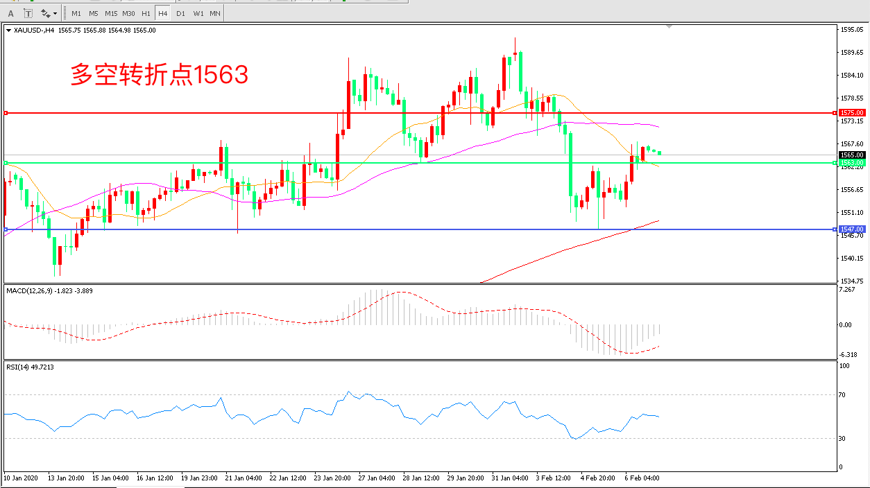 4小时图看,金价震荡反弹,整体走势有所回暖,1563成为短期多空分水岭, MACD绿柱缩短,RSI指标走平,日内延续震荡概率较大。