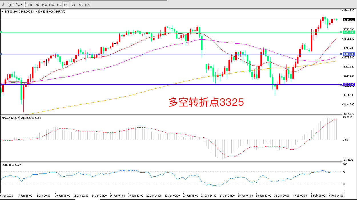 4小时图看,标普长阳连续拉升,整体表现强势,短期均线拐头向上MACD红柱增加,RSI指标走平,日内延续上行概率较大