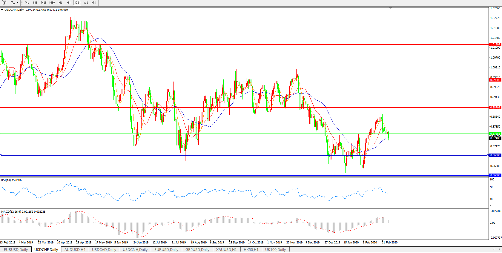 美元指数上涨0.17%至99.14,疫情忧虑带动美债大涨,推动指标10年期美债收益率连续第二日刷新纪录低位。法国巴黎银行北美外汇策略主管Daniel Katzive表示,考虑到我们在债市和股市方面看到的情况,你可能会预期美元兑日元汇率会出现更大幅度的下跌;相互角力最终令美元当日维持不变。Katzive称,今年美元走强的潜在趋势……这似乎基本上是因持续较宽的收益率差,公债收益率大幅下降,这在一定程度上减少了利差;欧元和日元等融资货币面临上行压力,因风险部位被回补,因此有两股互相抵消的力量。如果风险缓和下来,我认为美元可能会上涨一些,特别是如果市场出脱已消化的对美联储放宽政策的预期。德商银行FICC技术分析研究团队负责人Karen Jones认为,9月和10月低位0.9841/44,以及200日均线0.9954是美元兑瑞郎面临的强势阻力位。目前该货币对难突破阻力位0.9841,或面临进一步走低的风险。若价格低于0.9746(55日移动均线),上行的压力或减少,并使我们有足够理由重新将目标位定在1月低点的0.9613和2018年9月低点0.9543。