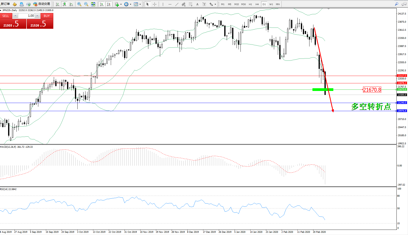 日经225指数2月27日(周四)收盘下跌463.69点,跌幅2.07%,报21962.50点。对公共卫生事件爆发将削弱全球增长的担忧惊扰了市场,再加之人们预期各地将放松货币政策。尽管日本央行的政策利率多年来一直维持在负数水平,但它在促进经济增长和通胀方面无济于事。此外,日本央行将政策利率和短期利率维持在-0.1%的水平,并将十年期政府债券的收益率控制在0%左右(收益率曲线控制)。最近有传言称日本央行可能需要进一步宽松。该央行最鸽派成员之一片冈刚士近日表示,日本央行下调利率是合理的,日本经济面临下行风险,个人对前景更加谨慎,准备在必要时表示毫不犹豫宽松政策。