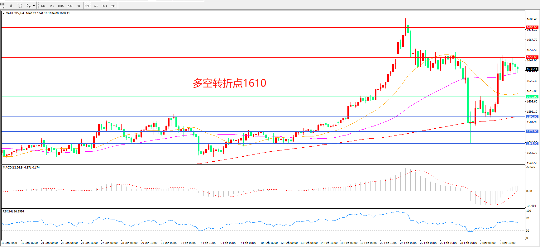 周三(3月4日),美联储的紧急降息引发了市场对新冠疫情的担忧,金价一度冲高,但随后美国公布有“小非农“之称的2月ADP就业数据,表现好于预期,金价震荡回落,收报1637.96美元/盎司。